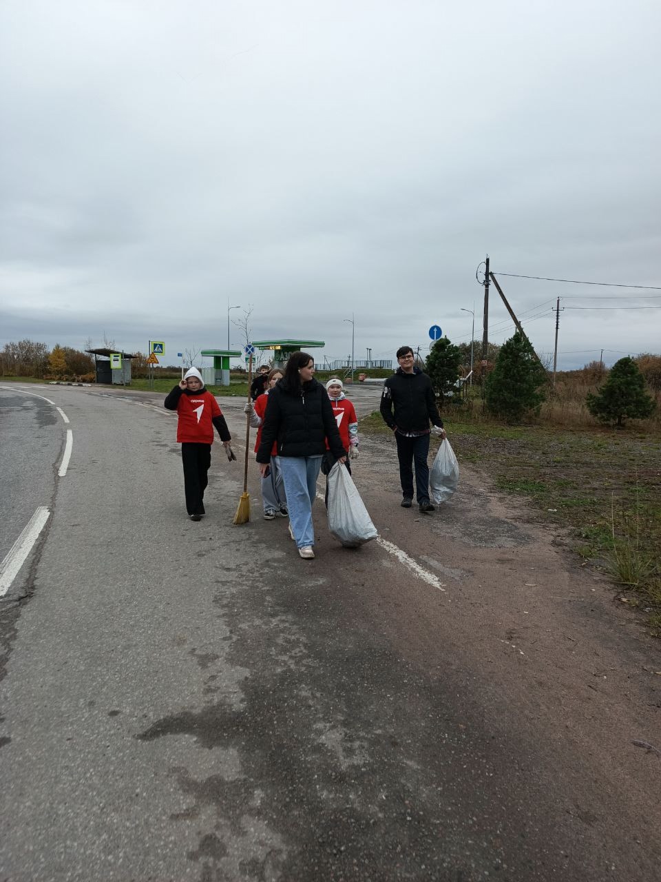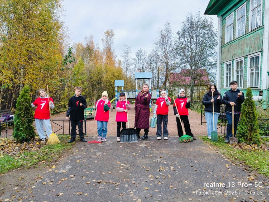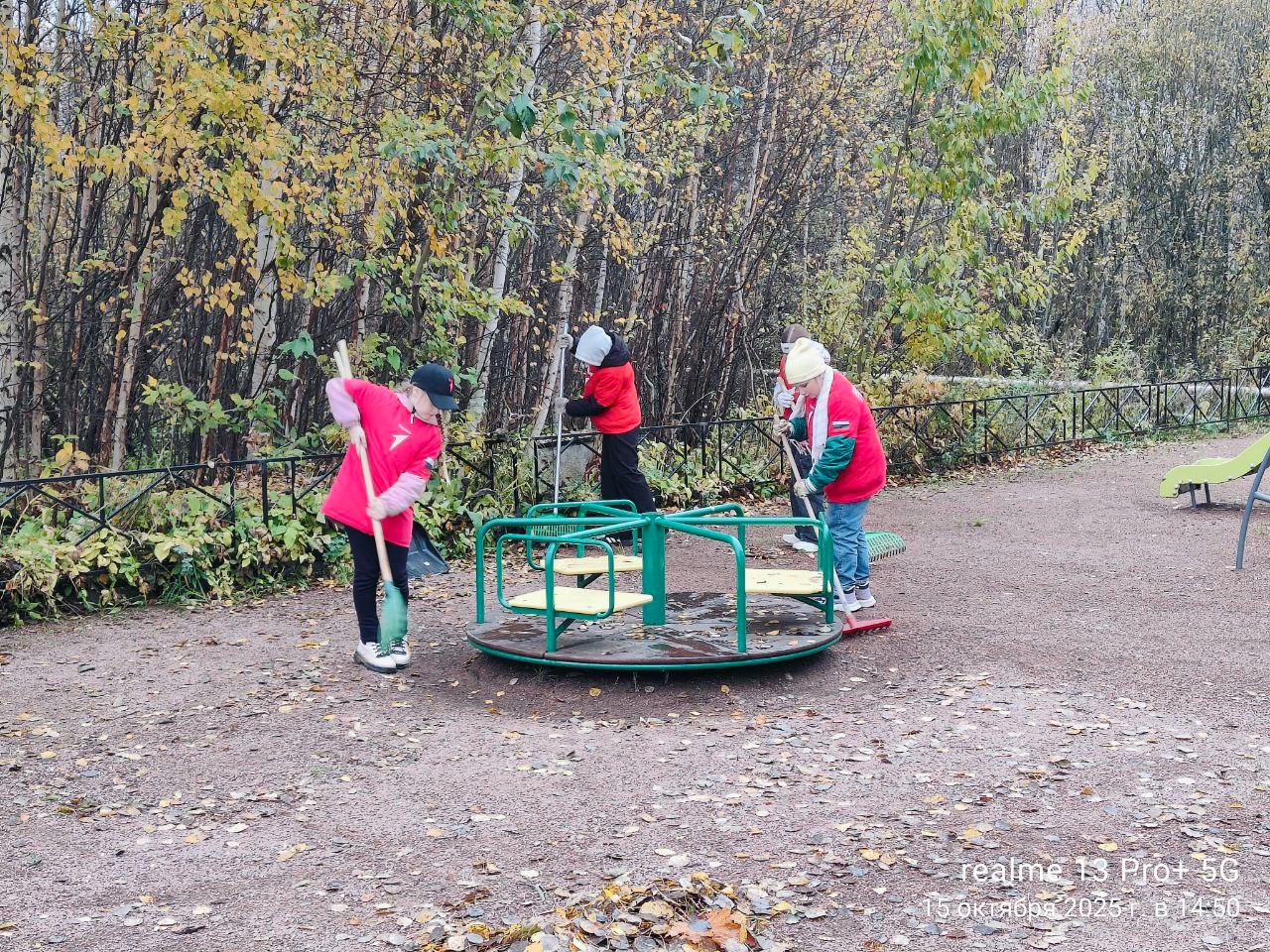 Уборка территорий Помимо посадки растений, активисты также приняли активное участие в уборке опавшей листвы на детской площадке.
